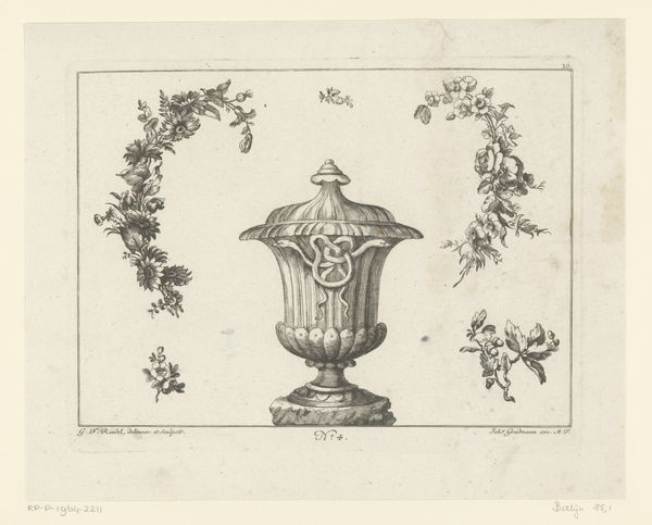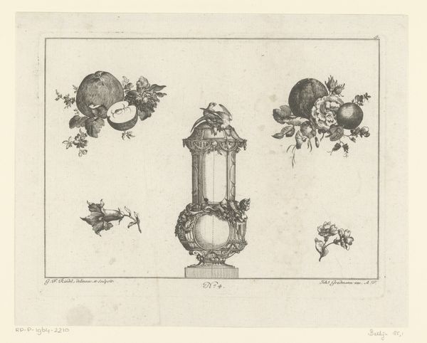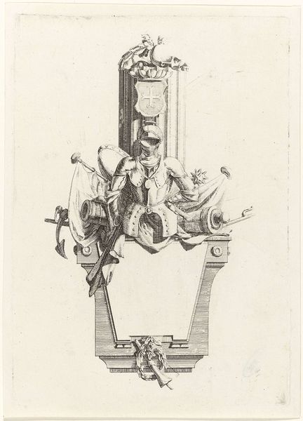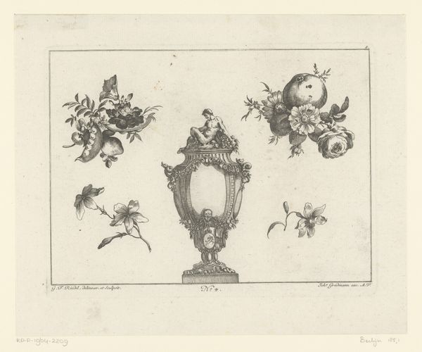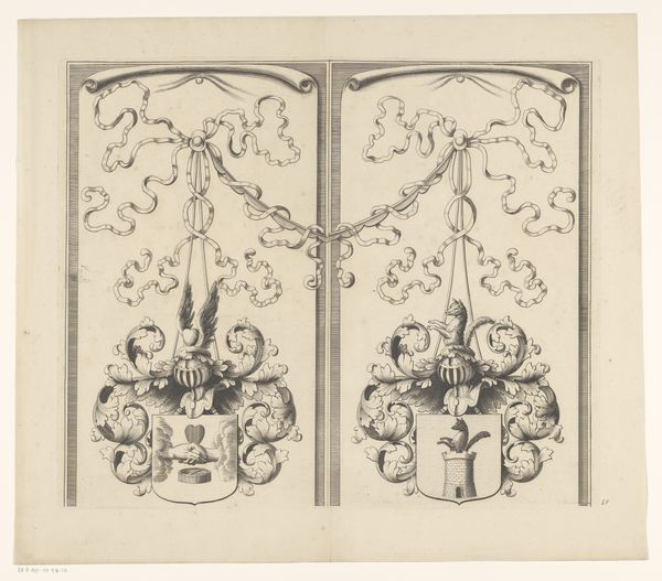 Editor: So, this is a section of a "Wapenrand van een kaart van de Alblasserwaard en de Vijfheerenlanden," dating back to 1716, by an anonymous artist. It’s rendered in ink, using drawing and engraving techniques. The symmetrical arrangement gives it such a formal feel, almost regal. What jumps out at you when you look at this? Curator: Isn't it enchanting? The way those cherubic figures playfully frame the heraldic shields, it whispers of a bygone era, a world where lineage and land were everything. And see how the flowing ribbons dance with the rigid lines of the crests. There's such a delicious tension there, a Baroque sensibility fully embraced. It’s as though the artist is saying, "Yes, we celebrate order, but let's also revel in the flourish." Don't you think? Editor: I do! The details are incredible. All of that painstaking detail must have taken an enormous amount of time. Are there symbolic aspects of the crests that would be recognised at the time? Curator: Absolutely. Heraldry, it's a whole language, isn't it? The deer, the lion, the arrows…each tells a story about the families these shields represent – their virtues, their histories, maybe even their little quirks! It's like a family motto etched in ink, promising all kinds of truths or hidden ambitions, which just delights me. You imagine what it would have meant for families to publicly affirm their role at the time, right? What I really want to know is what stories those families told… Editor: It gives the map so much more character knowing the history attached. Curator: Precisely! And perhaps even serves as an incentive to reflect on one's history... The perfect memento mori! Editor: Definitely! This piece has given me so much to think about; it really connects history to artistry.