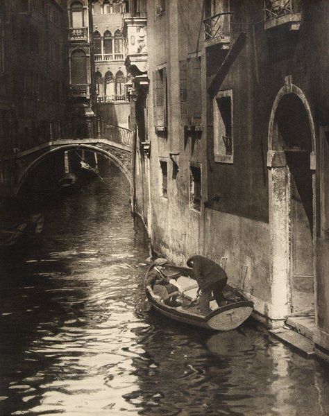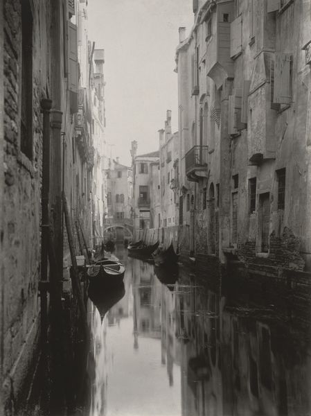 Editor: We're looking at "Untitled (II 8)," a print – most likely an etching – by Ferdinando Ongania, dating from around 1890. It’s a view of Venice, naturally, and the first thing that strikes me is how… staged it feels, almost theatrical, despite being a photograph. What's your take? Curator: Staged is an interesting word. Remember, photography at this time wasn’t as instantaneous as today. Photographers often emulated painting. Think about the late 19th century: Venice was experiencing a boom in tourism, particularly amongst the European and American elite, fueled by Romantic ideals. This image isn't just showing Venice; it's *selling* an idea of Venice, isn’t it? The 'exotic' and timeless city on the water. Editor: So you are saying the scene may be more crafted than a modern snapshot would be. It feels less like documentary and more like a carefully constructed… advertisement, maybe? For tourism? Curator: Exactly. Notice the gondola prominently placed. It evokes a particular lifestyle, right? How much of this scene do you think is “authentic” versus constructed to appeal to what wealthy tourists wanted to experience or take home as a souvenir? This is a genre scene reflecting the orientalist interpretation of Italy during the nineteenth century, like others found across Northern Africa and the Middle East. Editor: That's fascinating. The orientalist take changes my perspective. I was thinking primarily of aesthetics and photographic technique. How the soft focus makes it seem more romantic, but there is the sharp political reading too, where the image sells a constructed and ultimately artificial experience of Venetian reality. Curator: Indeed. Ongania, whether consciously or not, participates in the construction and dissemination of that imagery. So, perhaps the “stage” you noticed wasn’t accidental. It highlights how intertwined art and commerce, image-making and power, truly are. Editor: I hadn’t thought about it in terms of active participation. Seeing the image in terms of construction is different and important. Thanks for making me think about how socio-politics may have had a play into how Ongania approached this artwork!