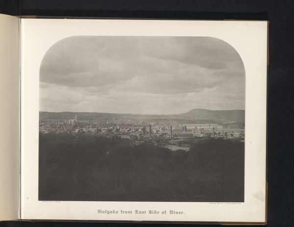 Curator: This albumen print, taken by M.P. Warner circa 1883 to 1888, is titled "Northerly from City Hall." It offers a panoramic view of a city nestled within a sprawling landscape. Editor: It's remarkably tranquil. The high vantage point gives a sense of order, almost like a benevolent surveyor’s gaze over the burgeoning town. Curator: Absolutely. Albumen prints, like this one, were known for their exceptional detail and tonal range, which enhanced the sense of depth and perspective in landscape photography. In terms of iconography, cities viewed from above often symbolize progress and dominion over nature, very popular ideals during that time. Editor: And I see this as more than progress. Look at how the light softens the industrial buildings and how prominently nature features. I'd argue it's not just about dominating nature but also negotiating with it. Perhaps the placement suggests an emergent awareness of ecological thinking, particularly within burgeoning industrialism. Curator: That's a compelling point. While the technology was cutting-edge at the time, we also see how Warner utilizes pictorialist techniques, softening edges to emulate painting and evoke emotion. The smokestacks hint at human impact. However, the distant mountain stands resilient and almost mocks industry as an ideal. Editor: That spire further centers it within its human context; it isn't solely about commerce or the state. The eye is carried beyond the settlement to contemplate what has lasting, transcendental meaning for future generations. It could even represent an implied social critique—how often did urbanization lead to increased social disparities? Curator: This photo offers insight into how people perceived themselves, where they belonged, and what it all meant. And that makes “Northerly from City Hall” far more than a snapshot. It embodies a dialogue between society, landscape, progress and identity. Editor: It feels less like a photograph and more like an artifact, pregnant with history, dreams, and perhaps warnings—a quiet manifesto from a bygone era about humanity's relationship with its surroundings.
