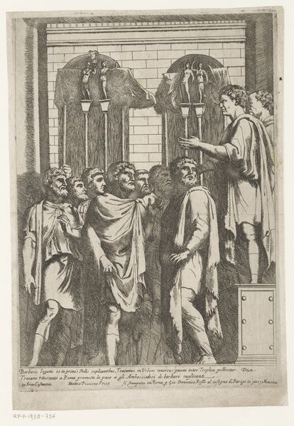 Curator: This is "The Marriage of Mary and Joseph," an engraving from 1590 by Ventura Salimbeni, found here in the Rijksmuseum collection. What's your initial take on this scene? Editor: My immediate reaction is that there’s a sense of theatrical staging here, everyone seems aware of the audience even though this depicts such an intimate scene. I wonder who the artwork's target audience may have been? Curator: That's perceptive. The drama is intentional, reflecting the Counter-Reformation's emphasis on emotional connection with religious narratives. Symbols abound: The dove overhead represents the Holy Spirit, ensuring we know this union has divine endorsement. And consider Mary's downcast eyes... Editor: I can see a tension that results from that divine endorsement: the gaze creates this strange push and pull where her consent, her agency in this whole transaction, is secondary, and, as the story goes, God ultimately claims primary claim over her body. Curator: Indeed. The artist balances the human drama with divine symbolism. The clothing, the architecture, they ground the sacred in the everyday world. Each figure is meticulously rendered with those clean lines, to convey a sense of importance but also spiritual significance. Editor: Although in reality, we know very little about this particular part of her life! How might the narrative itself and its visual representations uphold or resist certain cultural expectations around marriage, then and now? Curator: Precisely the types of question we want viewers to engage with. Even today, images like this have power, and we see iterations of the ‘perfect’ sacred bond—and that visual is rarely questioned, even when the origins or context is complex, as is the case here. Editor: Right. A sacred union with earthly implications and very gendered rules of engagement. These symbolic renderings, although crafted centuries ago, perpetuate ideas about roles, rights, and religious responsibilities within heterosexual norms and assumptions that exclude queer and other marginalized individuals from certain narratives of faith and inclusion. Curator: Thank you. It has made me contemplate what aspects of continuity and reinvention of traditional representations mean to diverse modern audiences today. Editor: Agreed, thinking about religious figures like Mary allows a space for unpacking the nuances of iconography and representation, and their role in perpetuating societal biases and norms over time.