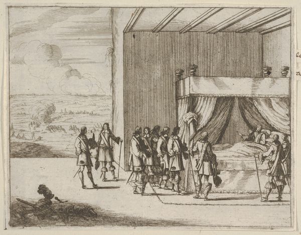 Curator: Looking at this engraving by Bartolomeo Fenice, dating back to 1659, I’m immediately struck by its quiet atmosphere, considering the grand subject matter implied in the title: Francesco I d'Este, with his Gentle Manner, is Loved by All of the Noblemen in his Court. Editor: It's got a distinctly performative air about it, doesn't it? The architecture feels almost like a stage set, all very controlled and deliberate. Even the way the light falls...everything feels managed, as if to convey specific meaning, although very little emotional texture gets through, really. Curator: Precisely. Fenice was part of a tradition deeply embedded in the political structures of his time. The printmaking process itself allowed for wide distribution of these idealized images of power, fostering specific desired representations of leadership. Engravings like this reinforced the Duke’s authority, circulating ideas of courtly grace, which could be copied, reinterpreted, and emulated, furthering a kind of Baroque brand. Editor: I suppose there's a sort of cold elegance to it, now that you mention it, but personally I can’t help but see it also as rather sad—these nobles, all essentially acting, posing, in service to a fabricated image, you almost feel like something about who the artist may be poking at, by how staged things look. Curator: But remember the conditions under which it was created, in times of continuous strife and shifts in European dominion and resources. An image promoting internal concord and an image of grace projected strength, just as an artist, Fenice had to survive too by the graces of noble employment. It’s not just aesthetics, but function! We also see an incredibly controlled application of hatching, a meticulous hand working, essentially creating tone through repetitive mark making... Editor: Yes, almost obsessively rendered. What a life; working always to make those in charge look nice! Curator: It invites one to consider the conditions of artistic creation itself, the layers of labor, social expectations, and perhaps also quiet defiance. Editor: Indeed, now when I look, I consider it something beyond representation alone. Thank you, that helped re-shape my perspective.