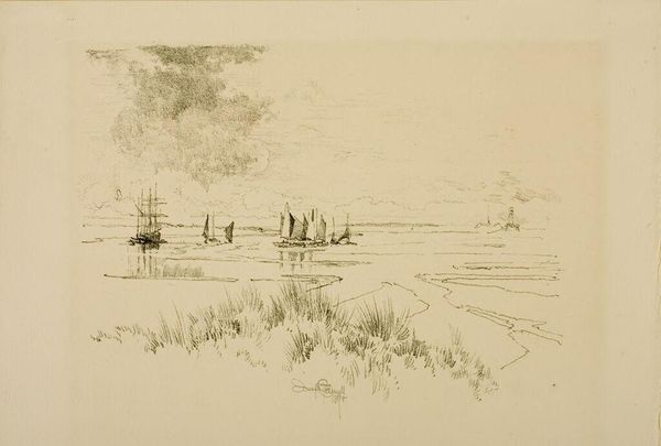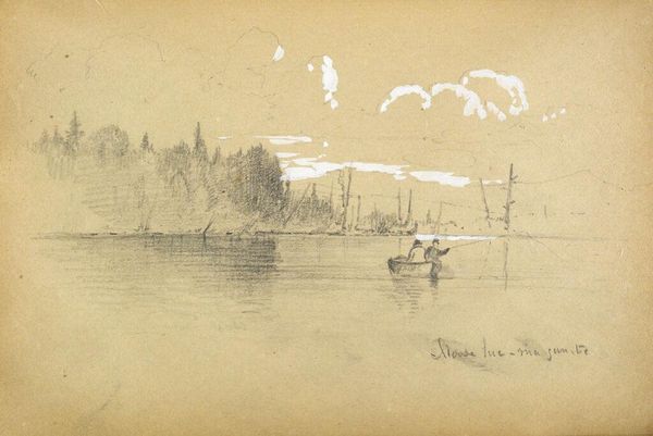 Editor: This is Benjamin Champney's "Small Boat on Lake Mooselucmaguntic, Maine." It's a small graphite drawing. It feels like a fleeting observation, capturing a quiet moment. What can you tell me about its place in art history? Curator: Well, think about the Hudson River School. Champney was working in an era where artists were deeply involved in shaping America's vision of itself through landscape. How might this sketch contribute to that larger narrative? Editor: It seems less grand, more intimate somehow. Curator: Exactly! The commercialization of wilderness, facilitated by art and tourism, was a complex process. This piece, by being so unassuming, offers a counterpoint to the monumental landscapes that were so popular. It democratizes the experience of nature. Editor: So, it’s less about promoting the sublime and more about personal connection? I never thought about art like that. Curator: Precisely. It reflects a shift in how landscape was perceived and consumed, making it relevant to a broader public.