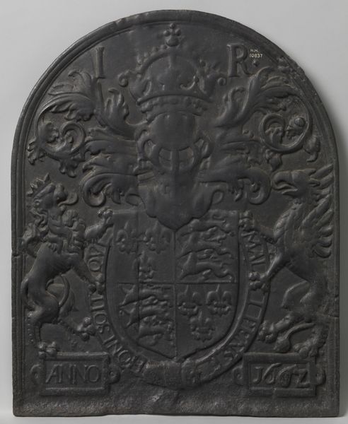 This iron fireback featuring Willem III was made in the Netherlands in 1696 by an anonymous artist. Firebacks like this one were placed in fireplaces to protect the wall from the fire's heat, but also to project status. The bust of William the Third is framed by leafy branches bearing fruit and surmounted by a flying angel blowing a trumpet. This imagery elevates William to a near-divine status, as he was seen as a defender of Protestantism and a champion of Dutch independence against the Catholic French monarchy. The use of symbolism to convey political messages was common in the Dutch Golden Age, a period of great social and economic change. Analyzing an object like this requires us to examine the complex relationships between art, politics, and social identity in the late 17th century. We can consult period documents, political tracts, and visual culture to more fully understand it. Ultimately, this fireback illuminates how art served as a tool for shaping public opinion and reinforcing social hierarchies.