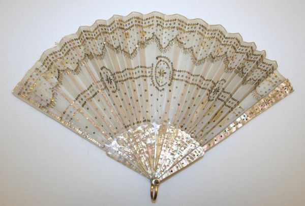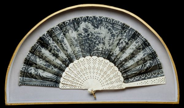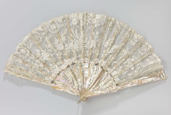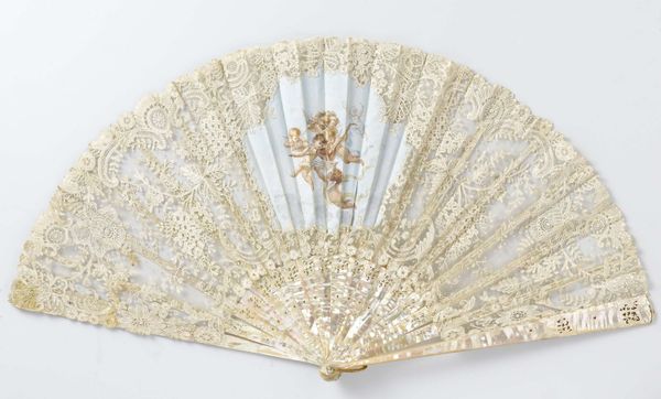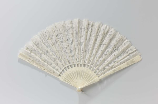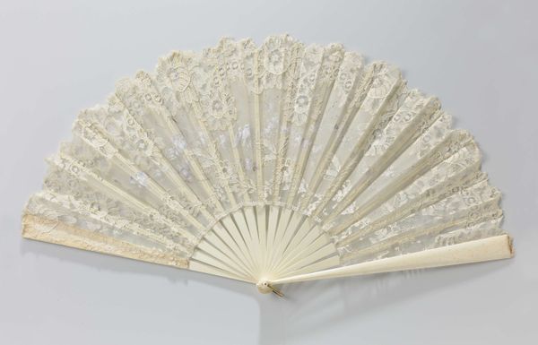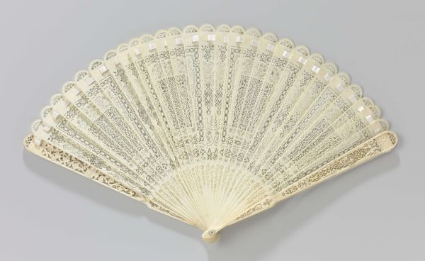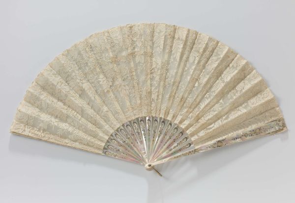 This fan, crafted by an anonymous artist, invites a close look at its intricate design. The overall effect is one of delicate symmetry, where a semi-circular expanse unfolds into a radiating pattern of lines and floral motifs. The neutral palette— dominated by creams and pearlescent hues— enhances the fan's complex texture. Viewed through the lens of semiotics, the fan transcends its utilitarian purpose, functioning as a signifier of social status and cultural refinement. The repetitive floral patterns, combined with the fan's formal symmetry, can be interpreted as a coded expression of femininity and social grace. Furthermore, the fan’s structure destabilizes the boundary between art and craft. Its design challenges fixed notions about art's function, inviting us to consider how everyday objects can embody complex cultural values. Ultimately, the fan's design encapsulates a blend of aesthetic beauty and social significance. As you consider the layers of its construction and meaning, reflect on how an object’s formal qualities extend into cultural and historical domains.