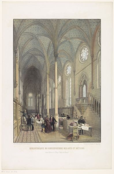 Curator: This watercolor and graphite work on paper, entitled "Interior of Christ Church" was completed around 1816 by Frederick MacKenzie. What strikes you most about it? Editor: Immediately, it’s the imposing scale. The artist renders this architecture with such precision, making the space feel both immense and somehow intimate, despite the soaring columns and vaulted ceiling. Curator: Yes, MacKenzie masterfully employs vertical lines, doesn't he? These columns create a sense of upward movement, guiding the viewer's eye through the architectural elements towards the light filtering in. Editor: And that light! Note how MacKenzie captures its ethereal quality as it bathes the interior. The subtle rendering emphasizes the sacredness of the space, while drawing attention to human rituals. Consider also that ornate organ centered above the apse – music being such a powerful component of faith. Curator: Precisely. Notice, too, how the light also defines the forms, creating highlights and shadows that articulate the texture of the stone and wood. Semiotically, this interplay can be read as a representation of spiritual illumination against earthly construction. Editor: Churches throughout history have long relied on familiar symbolic vocabularies. Light often represents the presence of the divine, architecture represents both God's house, and the heavenly abode. The people within partake of its shelter. Curator: Note the relatively muted palette. MacKenzie focuses on whites and earth tones and reserves small hints of deeper colors to accent architectural or symbolic highlights, thereby creating emphasis through restriction. Editor: Restriction in color, maybe, but the image offers a broad narrative sweep. It allows us to consider the place of community, faith, ritual, and the comfort offered by spiritual traditions through material expressions of shared heritage. Curator: It's intriguing how this essentially perspectival study transforms into an immersive experience, doesn’t it? Editor: Absolutely. I walked away pondering the resonance between symbolic imagery and architectural design on human experience, not to mention how faithfully those may have remained across time.