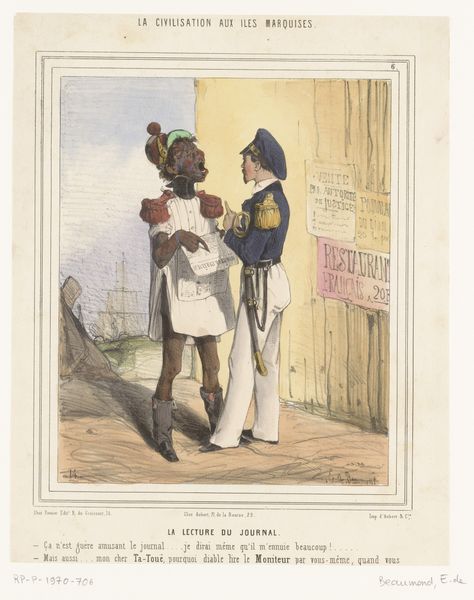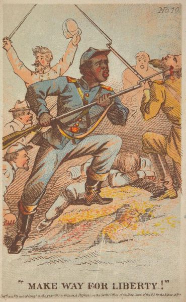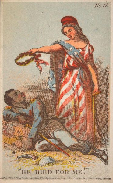 Editor: Here we have "The Parting - 'Buy us too'" by Henry Louis Stephens. It's a small print, maybe meant for a book? The scene is just heartbreaking. What strikes you most about this work? Curator: The raw plea in the title, the casual cruelty, it just hangs there. Stephens captures the economics of dehumanization, doesn't he? Notice how the color separates the figures. What does that evoke for you? Editor: A sense of division, of course. It's so matter-of-fact, which makes it even more disturbing. I hadn't considered the use of color like that. Curator: It’s a period piece, so there's a definite worldview being presented. But its emotional punch still lands. Editor: Absolutely. It makes you wonder about the artist’s intentions and what kind of statement he was trying to make.