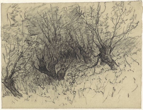 Editor: We're looking at Kees Stoop's "Struikgewas en geboomte," possibly from 1986, a landscape drawing rendered in graphite. It feels immediate and a bit raw, focusing on the textures of the trees and undergrowth. What strikes you about it? Curator: What's most interesting to me is the labor evident in this work. Consider the act of repeatedly applying graphite to paper, a readily available material. It blurs the lines between artistic creation and manual task. Does it feel almost like documentation to you? Editor: Documentation? In what sense? Curator: The repeated marks, the close observation of the natural forms…It feels less like idealization and more like a record of a specific place and time. Think about Stoop’s choice of graphite - its accessibility implies a democratic approach to artmaking, where value lies in the action, not necessarily in the preciousness of materials. Do you get the sense of someone at work here? Editor: Definitely, especially with the almost frenetic energy in the shading. So, you’re suggesting the value comes from Stoop's process and the labor, which demystifies traditional notions of artistic genius? Curator: Exactly! We see how the means of production shapes the meaning. It moves beyond just representation, highlighting the inherent social dimensions of even the simplest landscape. Editor: That makes me look at the drawing in a totally different light, noticing the mark-making as almost more important than the trees themselves! Curator: Yes, that is correct. Now, I wonder what this would have felt like to the artist. Thank you for helping bring awareness to what materials tell us!