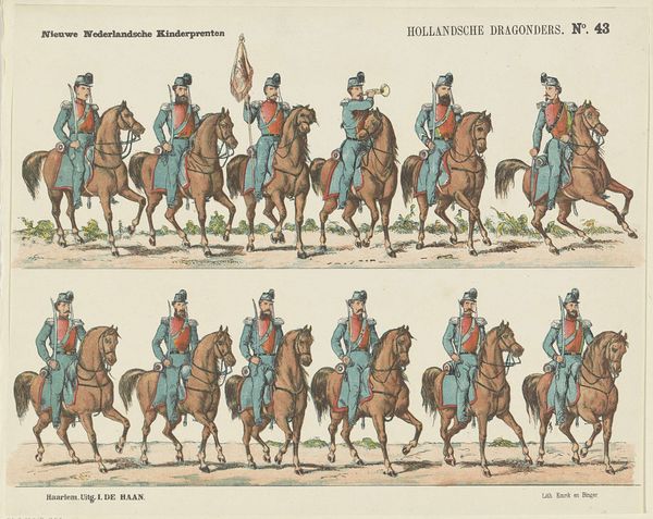 Editor: This is “Nederlandsche Leger,” or “Netherlands Army,” an etching from 1873 by De Ruyter & Meijer. It feels very official, like a military chart, neatly categorizing the different branches. What strikes you most when you look at it? Curator: Immediately, I consider the function of this print in 1873. It’s not simply a portrait of soldiers; it’s a representation carefully curated for public consumption. Academic art, even in printed form, played a significant role in shaping national identity and projecting power. Why present the army in this particular way? What was the purpose of disseminating this image? Editor: So, you are thinking less about artistic expression and more about… propaganda, almost? Curator: Not necessarily blatant propaganda, but certainly image management. The clear classifications, the neat rows – this reinforces the idea of order and control within the Dutch military. And consider when this was made – 1873. The Netherlands was actively engaged in colonial endeavors, particularly in the Dutch East Indies. Editor: How would that context influence this image? Curator: This image implicitly communicates strength and competence. Displaying well-organized infantry, cavalry and artillery subtly signals their ability to maintain order, both at home and in the colonies. The etching also would have served a function of defining and communicating the ranks within the Netherlands Army, informing civilians, and also individuals joining the army about career progression paths, from foot soldier, to Hussar, to Artillerist. Editor: I never considered it from that perspective! I was just seeing a slightly dull historical document, but it clearly has deeper layers reflecting the political climate. Curator: Exactly. And by recognizing that relationship between art and politics, we gain a much richer understanding of its cultural significance.