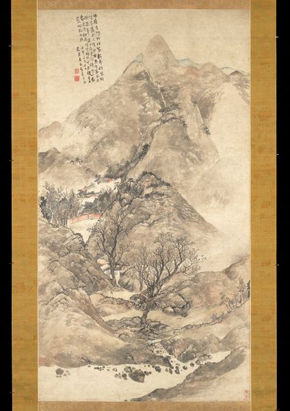 Curator: Immediately, the delicacy in the brushstrokes makes an impression, there's something very elegant at play in the contrasts between empty space and the carefully delineated forms. Editor: This ink-on-paper landscape just breathes, doesn’t it? It's subdued, almost monochromatic... like a memory surfacing in the early morning mist. Curator: We're looking at "Bamboo and Plum in Early Spring," an ink and tempera work painted by Okada Hankō in 1843. It's an excellent example of the Japanese Nanga tradition, with its focus on literati ideals and the natural world. Note the structure of the composition; it creates depth through the arrangement of overlapping planes. Editor: You know, I see such longing here, that little bridge, those houses tucked away. I bet Okada Hankeō wasn't painting what he saw so much as what he yearned for—some quiet place of refuge. Curator: The painting, indeed, is structured as a philosophical construct as much as it is a depiction of a real space, think of the placement of the mountains— their verticality gives the entire work a spiritual upward motion. Editor: Spirituality, yes, absolutely! And beyond the formal elements there is just pure emotion. To me this represents the essence of a place as one feels it and remembers it: the coolness of water, the scent of the pines... It's all held within this composition, not exactly rendered but evoked with those thin lines and layered greys. Curator: Perhaps we could say it reflects a deeper interplay between realism and representation and the power to reveal nature and thought in combined imagery. Editor: Beautifully put! The realness and un-realness comingling on a flat plane, isn’t that all that any of us could wish to accomplish, eh? Curator: That about sums it up.