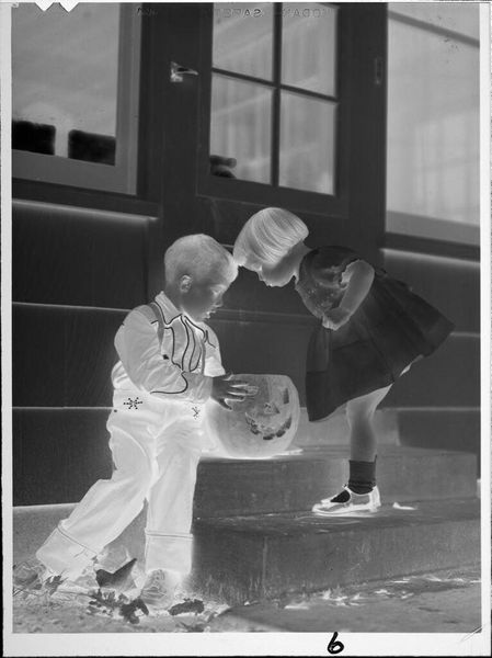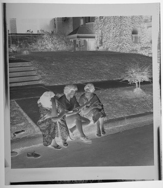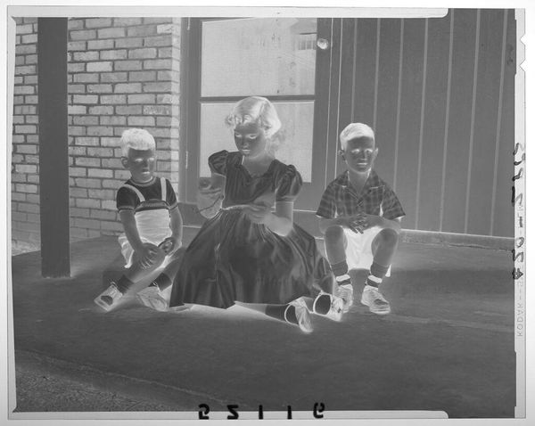 Editor: This is Martin Schweig’s Untitled photograph, showing three kids petting a dog on some front steps. I find its inverted colors create a feeling of distance and mystery, like a faded memory. What draws your eye to this piece? Curator: The dreamlike quality, absolutely. It reminds me of childhood summers and the way light filters through leaves, creating these dappled shadows. The photo is both familiar and otherworldly. Have you noticed how the dog seems to be the brightest element? Editor: Yes, it's as if the dog is the heart of the photograph. It feels so innocent. Curator: Indeed! It is an amazing capture, isn’t it? It makes one appreciate the fragile beauty of everyday moments and question if it is the dog who is the focus or the children? Editor: It really does. I'll definitely look at family snapshots differently now. Curator: Me too!