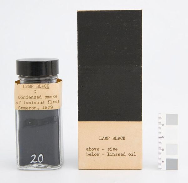 Curator: This is "Black Oxide of Cobalt," a pigment manufactured by J.D. Pemberthy of London. Editor: It’s surprisingly austere, almost melancholy. The subdued tones and labeling create a sense of restraint. Curator: The visual arrangement is quite striking: a bottle of the pigment itself and a sample application. We see the raw material alongside its potential. Editor: Cobalt, historically, has carried connotations of depth and even the mystical. It reminds me of alchemists, searching for symbolic transformations. Curator: The piece is a potent reminder of art's fundamental components—color, material, form—elements that transcend the image itself. Editor: Indeed. The history and meaning of color itself, held here in simple forms. Curator: I agree, it is a fascinating study in color theory and symbolic association. Editor: A compelling demonstration of the artist's palette.