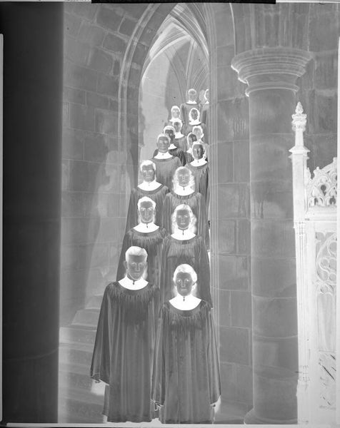 Curator: This photograph by Harris & Ewing, currently titled "Untitled (ordination class, Holy Name College)," captures a moment frozen in time. Editor: My first impression is how the negative space transforms the figures into almost spectral forms; they seem to hover between worlds. Curator: Indeed, the stark contrast enhances the visual impact of the white robes, reminiscent of purity and spiritual ascension, a very established visual vocabulary. Editor: But who has access to such symbolism? Consider the historical context—ordination was, and often remains, an exclusive rite, barring many based on gender and other identities. Curator: The architecture framing the men also speaks volumes. The church entrance is a literal gateway to the divine, reinforcing the exclusive nature of religious authority. Editor: Exactly, the image isn't merely a neutral record; it's a document of power dynamics, a stark reminder of who is deemed worthy and who is excluded. Curator: A powerful testament to how visual cues within such an image have held collective meaning for decades. Editor: And one that demands we look critically at these enduring structures and what they truly represent.