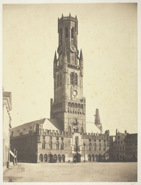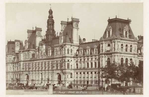 Editor: This collotype print, "Exterieur van het stadhuis van Compiègne met een bas-reliëf van Lodewijk XII" by Médéric Mieusement, probably created between 1880 and 1900, presents this building in very fine detail. It gives it an imposing appearance! How does this image speak to you? Curator: The imposing nature is intentional, a reflection of the late 19th-century interest in civic pride and the legitimization of power through architecture. Mieusement’s photograph highlights the Compiègne city hall as not just a building, but as a stage for representing historical authority. Note how the bas-relief of Louis XII is prominently featured. Why do you think that is? Editor: Perhaps to link the town hall to a prestigious figure from the past? Curator: Precisely. Think about the socio-political context: this photograph was produced in an era of intense national identity formation and political maneuvering in France. Public imagery, like photographs and architectural details, became a battleground for defining national history and civic values. How might this photograph have been used to promote a specific image of Compiègne? Editor: Well, showcasing its rich historical connection with royalty could attract tourism and boost the city’s status, right? Curator: Exactly. And further, by disseminating this image widely through print, the town actively participated in shaping its public perception. This print makes a grand statement about civic identity at the turn of the century. Editor: I hadn't considered how actively the city would be branding itself, even back then. Thanks, I have a much better understanding now. Curator: And I was made to remember how photography has always served the purposes of those who disseminate it. Thank you.