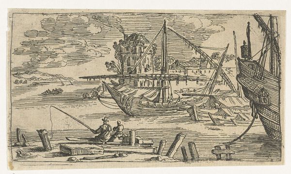 Curator: Here we have "Bridge Builders," a 1912 etching by Bror Julius Olsson Nordfeldt, held at the Minneapolis Institute of Art. Editor: My first impression is somber; the overwhelming grays punctuated by smoke suggest something powerful and, at the same time, ominous. The visual density almost flattens the space. Curator: The composition does channel a profound historical moment. Nordfeldt chose to depict the burgeoning industrial landscape, a cityscape dense with symbolic potential for progress and the challenges it presented. Look how he focuses on figures actively engaged in building—connecting and creating new pathways across divides. Editor: The network of fine lines describing every surface—water, buildings, smoke—contributes to a textural field, an intricate and consistent fabric throughout. Does the repetitive stroke signify some continuous cycle in this industrialized vision? Curator: The relentless detail emphasizes both human agency and the cost. Smoke becomes an important symbol, visually connecting the human endeavor to questions of environmental and social impact, even morality. Notice how those bridge builders in the boats are dwarfed by the scale of the factories behind them? Editor: The atmospheric effects do create a palpable tension, contrasting man's potential with its repercussions. It seems the lines converge at points, like dark knots. Do those patterns imply particular nodes of influence within the industrial expansion? Curator: You have it! Each etched line suggests causality. These images were crafted to resonate through time and connect across generations—revealing, I think, a human need to reshape, adapt, and ultimately rebuild. Editor: Viewing it this way offers more to appreciate beyond formal devices and makes it a vital statement on the ethos of an era. I can say I've learned something today!