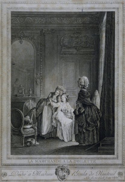 This is an anonymous design for a book illustration: a soldier approaching a couple. The artwork presents a scene of conflict. Two uniformed soldiers frame a couple in what seems to be a parlor setting. The woman raises her hand in a gesture of warding off one of the soldiers. How are we to read this image? Is this an image about the cost of war, the disruption of domestic life? Or something else? Perhaps it would be useful to think about the era in which this was made; the late 18th century was a time of significant upheaval. Revolutions, shifting social structures, and new ideas about citizenship created instability, particularly for women. With its play of power dynamics and gendered expectations, this illustration can be viewed as a lens through which we see the negotiation of personal and political tensions. What stories might this image tell us? What roles do these figures play in the larger narratives of their time?