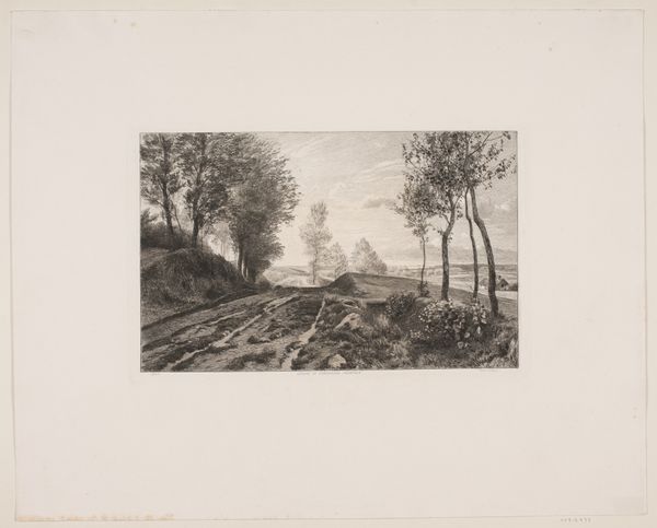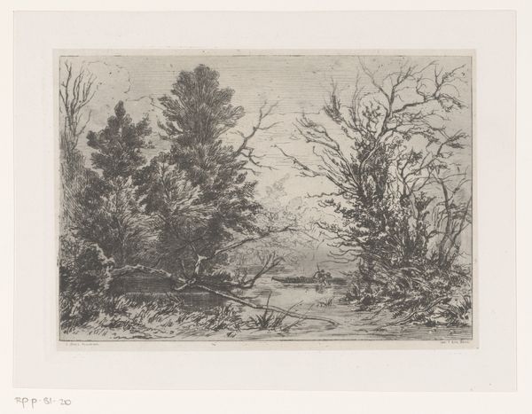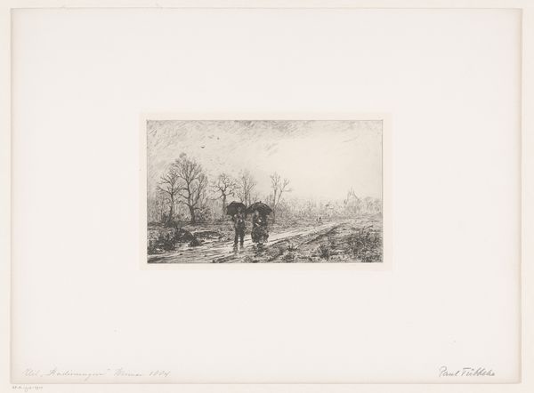 Curator: What a wonderfully atmospheric piece this is. Auguste Danse created this print, titled "Nachtelijk sneeuwlandschap met schimmige figuren op het pad"—"Nocturnal snow landscape with shadowy figures on the path"—in 1885. It’s part of the Rijksmuseum collection. Editor: Ooh, instantly I feel…melancholy, right? It's very quiet and still, but not necessarily in a peaceful way. Those shadowy figures feel more ominous than comforting in the snowy landscape. Curator: Absolutely. I think that tension is key. Danse, working in that Impressionist style, really captures a specific mood and also plays with ideas of marginalization; Danse worked tirelessly for social reforms and saw the landscape tradition as part of constructing and imagining new senses of place in the face of urban blight. Editor: The printmaking technique definitely adds to that mood too. The lightness and almost ephemeral quality of the lines really mirrors the transient nature of a snowfall. There's also something about the lack of bold contrasts, with pale, natural colours, a choice for that soft natural lighting. The work allows space to think, reflect. Curator: You are right: it isn't just about representing a scene, but creating an atmosphere. These natural tones, what remains unprinted – this negative space in printmaking terminology – lets the viewer imagine details that aren't explicitly there. A metaphor, perhaps, for the unseen struggles and quiet resilience of those shadowed figures making their way in the dark, not given bold recognition. The choice of landscape is also very relevant to understanding shifts of imagery; the landscape wasn’t this picturesque uninhabited zone, but was where ordinary people actually live. Editor: It’s a work that quietly unfolds as you keep looking, doesn't it? And the fact that it’s a print – multiple copies existing – brings a layer of accessibility, a silent invitation for broader engagement with that shared feeling of being out in the winter cold. Curator: Precisely. A subtle, evocative statement that resonates with anyone who's ever felt a touch of solitude amidst a vast, indifferent world. Editor: Well, after that, I'm reaching for a cup of hot cocoa... with maybe a dash of something a bit stronger!