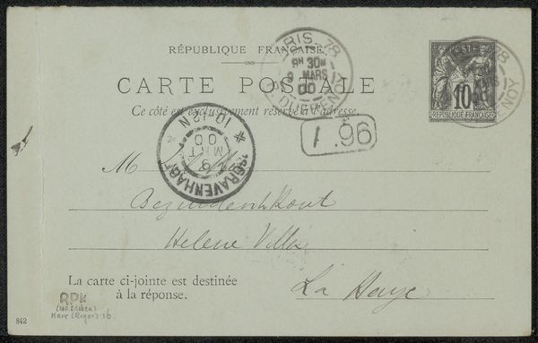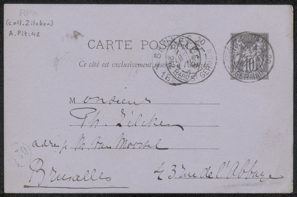 Curator: This is a piece entitled "Briefkaart aan Philip Zilcken," created before 1889 by Adriaan Pit. It is currently held in the collection here at the Rijksmuseum. The piece appears to be pen on paper, classified as a drawing and a print. Editor: There is a ghostly stillness, and fragility to it. All those faded gray tones – it's like catching a whisper from the past, muted and personal. Curator: Indeed, the monochromatic scheme emphasizes the careful composition. Note the deliberate arrangement of the postage marks at the top and the placement of the text block in relation to them. The cursive script seems to serve more as texture and mark-making, rather than purely linguistic inscription. Editor: Those circular postage marks certainly bring to mind ritual seals and their official pronouncements, framing and legitimizing the handwritten message. And the postmarks indicating Paris - from "l'Opera" itself – surely speak to a shared artistic world and a certain aspiration on the part of the writer, wouldn’t you agree? Curator: Certainly, the choice of Opera postmarks can be viewed as an indication of Pit's and Zilcken's involvement in the cultural milieu of Paris, adding layers of significance to their personal exchange. It suggests a deliberate curatorial intention on Pit's part regarding his public persona as reflected through personal correspondence. Editor: The address – to "Petit loo" in "La Haye"– points towards Zilcken’s life, rooting him to place. There’s a feeling of longing and memory embedded in those details – the private and quotidian rendered monumental by time. The idea that this was important enough to preserve—fascinating. Curator: Well, now that we are nearing the close of our commentary, what started out as an apparently basic briefkaart shows the value that is found in material history, the aesthetic interplay of text, and postal insignia as meaningful composition devices, truly illustrating how communication shapes understanding, don't you think? Editor: Absolutely, reflecting on this little piece reveals the immense power of visual symbols and details to evoke memory, identity, and the passage of time itself, wouldn’t you say?