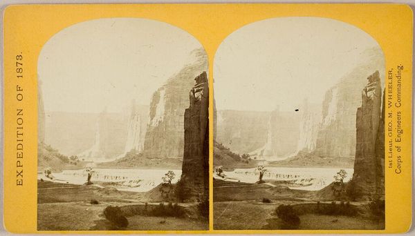 Editor: This is "Trinalcove," a stereograph by Elias Olcott Beaman. The muted tones create a sense of timelessness. What historical narratives do you think this photograph engages with? Curator: This photograph participates in the history of Western expansion and the visual construction of the American West as a sublime, untamed space ripe for exploration and exploitation. The act of photographing such landscapes was itself a form of claiming and controlling them. Editor: So, it's less about pure documentation and more about shaping a particular vision? Curator: Exactly. Consider how the framing and composition might reinforce ideas about frontier and manifest destiny that were circulating at that time. What do you think? Editor: I hadn't thought about that. It reframes how I view these images. Curator: Right! It's a visual representation of socio-political forces, shaping perceptions of the West.