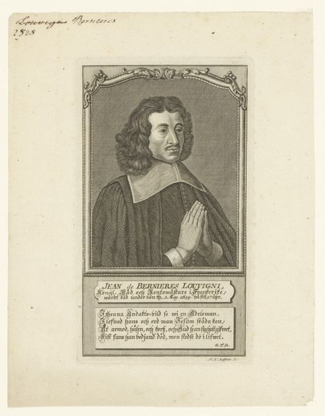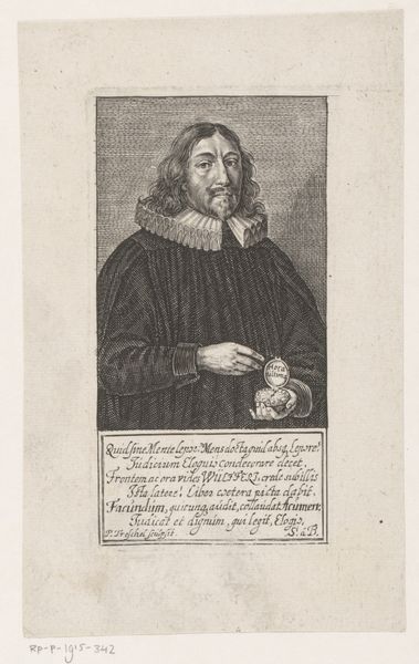Curator: Before us hangs a printed portrait dating roughly from 1672 to 1720. The piece immortalizes Johann Jodocus Felwinger, crafted using etching and engraving techniques. What are your initial thoughts? Editor: I'm immediately struck by the tonal contrasts—the way the light catches Felwinger's elaborate wig against the darker backdrop creates such depth, wouldn't you agree? Curator: Absolutely. And situating Felwinger in his historical moment is key. A professor of politics, his very image is an assertion of status and intellectual authority in a society grappling with evolving power structures. That cascade of hair, the somber robes – symbols of entrenched societal roles. Editor: Quite. Note also how the sharp lines define not only his features but also the symbolic objects surrounding him. The carefully rendered books, the draped curtain...they’re almost hyper-realistic. Do you think it's meant to signal something beyond mere representation? Curator: Definitely. These are all visual cues meant to reinforce his persona and role in society. Let's also think about who had access to printed portraits like these. It was undoubtedly an exclusive circulation, reaching an educated and privileged audience. The Latin text, with it’s mention of Felwinger's academic achievements, serves a key function in limiting the sphere of cultural influence. Editor: It's interesting that, while the inscription confirms his credentials, it is contained and ordered neatly below. It is distinct from his bearing, from his direct gaze, and also in contrast to the wildness of the wig itself. What about that intense eye contact he makes? Does that tie into your socio-historical view? Curator: It solidifies it, truly. He is making a statement of presence in a world increasingly shaped by new ideas. But even his controlled and studied gaze contains a whole set of established social cues—who can stare back? Who should look away? Editor: It seems to invite interrogation even now. Well, examining the form and historical setting here provides a more complete picture, truly. Curator: I concur, it always serves to peel back the layers and see what sits underneath.