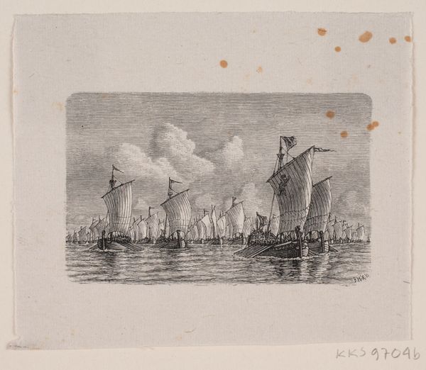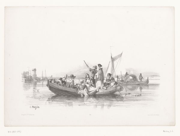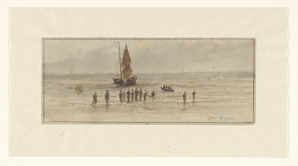 Curator: It's hard not to be drawn to the serenity of this piece. A quiet journey, wouldn’t you say? Editor: Absolutely. There’s a tranquil spaciousness here that’s almost deceptive given its scale. “Sloep vervoert officieren naar een schip,” a watercolour and coloured pencil drawing whose creation is dated somewhere between 1829 and 1879 by Ary Pleijsier. The horizontal composition spreads out invitingly. Curator: I’m fascinated by how the artist depicts power through scale and setting. These aren't just men in a boat. The officers, stiff and proper, represent something bigger—a colonial system at play upon those very seas. Editor: I agree the hierarchy is palpable. The boat slices the water horizontally which mirrors the stark separation between the vast sky above and the dark depths beneath the surface. The tension is very striking here! Curator: Observe the symbolic nature of water. Often a symbol of transformation and fluidity, it surrounds the vessel ferrying these symbols of societal power—officers, who are bound for a larger ship—a potent symbol of their expanding empire. I wonder if Pleijsier intentionally painted the distant, hazy landscape to emphasize the idea of unattainable ambition. Editor: From a purely compositional angle, I'm interested in how the artist directs our eye. The receding line of the boat leads us towards the towering ship. This draws our eye but also underscores how diminutive it actually looks! Curator: Perhaps the ambiguity stems from its dating. It occupies an interesting historical juncture. At what stage were these officers situated within their nation’s unfolding legacy? Does the work function as commentary, critique, or endorsement? These visual cues make such pieces so incredibly relevant! Editor: It's the painting's own material limitations—the watercolours' delicate transparency and the gentle grain of the coloured pencil—that give the overall scene such striking restraint, almost forcing you to look for signs of tension below its rather unremarkable facade. Curator: A powerful insight. I’ll keep that in mind next time I observe this unique historical moment frozen in watercolour.