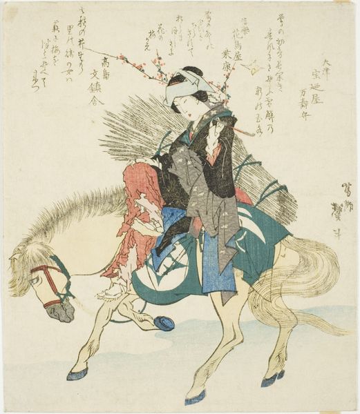 Curator: I’m immediately struck by the wild energy—it feels almost chaotic, yet undeniably dynamic. The lines, the posture of the rider… What is this, exactly? Editor: This is a woodblock print from the late 19th century, created around 1890-1900 by Yanagawa Shigenobu. It is entitled “Miura no Ôsuke te paard”, and you can see it here at the Rijksmuseum. Curator: Ôsuke on horseback, indeed. Tell me more about Miura no Ôsuke. The horse seems to personify the brute force of nature while the rider has this look like a fierce god riding wind. The man on the horse is holding some sort of stick or weapon…is it symbolic of power or social control in a traditional Japanese narrative? Editor: Absolutely. Figures like Miura no Ôsuke were often portrayed as paragons of military virtue, reflecting samurai ideals that were undergoing a resurgence during the Meiji Restoration. Consider that woodblock prints themselves, once cheap, popular art, gained a new appreciation among collectors as Japan engaged with the West. Their visual language evoked nostalgia for an imagined feudal past. The way that Ukiyo-e captured these powerful figures also helped form perceptions that persist today, particularly of the samurai class. Curator: And that's really powerful. The upward thrust of the horse and rider create a kind of visual mythology for the emerging national identity. We're not simply seeing a portrait, but a crafted icon that blends heroism and cultural aspirations. Look at how the textures vary: rough strokes depict the mane and tail while flatter planes make up the figure's clothing, all working to enhance symbolic resonance. Editor: The distribution and the celebration of the historical heroes in a format like woodblock printing underscore how history is mobilized to solidify national feeling. In a period when Japan was intensely modernizing and also asserting itself on the global stage, seeing these figures reaffirmed distinctiveness while also asserting power. The iconography becomes tied up with ideas of Japan's martial spirit, part of the language being formed during this intense time of political change. Curator: This certainly lends a fresh layer to this artwork, seeing it both as art and social propaganda. It is not just Ôsuke on a horse—it embodies values, national dreams, perhaps even unspoken anxieties. Editor: Exactly! So the next time you look at “Miura no Ôsuke te paard”, perhaps it will offer you an idea about how collective identities get manufactured in ways that reflect socio-political context.