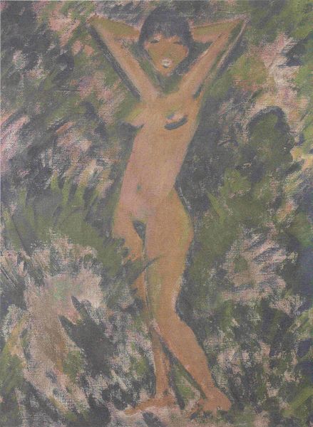 Editor: We're looking at Frederick Carl Frieseke's "Nude in a Glade," an oil painting from 1910. The dappled sunlight and lush greenery create a beautiful scene, almost dreamlike. I'm curious, how do you interpret this work in terms of its historical context? Curator: This painting exists within a complex historical moment regarding the representation of the female body and its relationship to nature. Frieseke, influenced by Impressionism, presents a figure seemingly at peace within the landscape. But what does it mean to depict a nude woman so idyllically, especially when considering the societal constraints placed on women during the early 20th century? Does the artwork reinforce or subvert those constraints? Editor: That's a really interesting point. It feels like an escape, but I see what you mean about the potential contradictions. Curator: Exactly. Consider the male gaze that often dominates artistic depictions of women. Is this simply another example of that? Or, by placing the woman in a natural, unburdened setting, is Frieseke perhaps commenting on the artificiality of those societal constraints? The brushwork itself is key—the fragmented strokes break down the traditional idealized form. What's your perspective on that relationship to the Impressionist movement and perhaps challenging older concepts about painting the female nude? Editor: It’s almost like he’s using the impressionistic style to subtly question those norms, pushing back while still operating within the tradition. The fractured forms disrupting a solid body. Curator: Precisely! This dialogue is what makes art history so fascinating—it allows us to constantly re-evaluate how art reflects and shapes our understanding of identity and societal expectations. Editor: I see how digging into these historical and social factors can reveal so much more than just what’s on the surface of the canvas. Thanks for helping me look deeper!