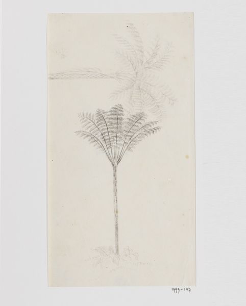 Curator: At first glance, this pencil drawing from the period of 1820 to 1824 appears to be an exercise in capturing the essence of plant life. Its fine, detailed strokes sketch a Fjerpalme og dværgpalme – Feather Palm and Dwarf Palm. Editor: There's a simplicity to it, wouldn't you agree? The pencil on paper allows for an honest observation of the palm's physical forms, the lines meticulously constructing leaf shapes and textural nuances of its trunk. It brings an intriguing sense of craft. Curator: I see what you mean about the craft itself. These particular palm trees hold significant symbolic weight; the feather palm often connected to concepts of immortality and paradise in various cultures, while dwarf palms embody resilience, their compact forms defying harsh conditions. Editor: I suppose the choice of pencil underscores the artist's intimate engagement. It's about mark-making. Look at the light and shadows suggested solely through the density of pencil strokes. We have access to the artistic process, the materials at hand allowing careful manipulation of detail. Curator: And consider this: the Romantic era in which it was conceived saw nature as a conduit to the sublime. By focusing on palms, Rørbye also invites us to contemplate exoticism, journeys, and perhaps even the Garden of Eden, far removed from Denmark's landscapes. Editor: It really forces one to think about the value attached to these seemingly simple plants and drawings. Are they commodities, signs of prestige? The botanical details make them a sort of specimen, pointing to questions about classification, access to, and control of the natural world through its image. Curator: A powerful visual depiction indeed. The lines in it, from base to the highest frond, direct our eye in constant circulation and observation! Editor: Ultimately, for me, this is a piece about quiet observation and material investigation. Thanks to it, a drawing gives a plant a new material life within a social structure.