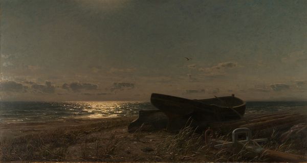 Editor: Here we have Carl Bloch's 1885 oil painting, "Full moon effect on the sea at Hellebaek." The moonlit water feels so tranquil. What do you see in this piece? Curator: Beyond the apparent serenity, I see a deliberate construction of national identity during a time of significant social and political upheaval in Denmark. Consider the late 19th century: nationalism was intertwined with Romantic ideals and artistic depictions of 'homeland.' Bloch is not simply painting a seascape; he is performing and constructing a specific vision of Danish identity rooted in a harmonious relationship with nature. Who is included, and who is notably excluded, from this romantic vision? Editor: So, you're suggesting it’s more than just a pretty picture, that there's a political dimension? Curator: Exactly! Think about the subjects deemed worthy of representation during this period. Working-class figures and other marginalized communities were often absent from idyllic scenes like this, obscuring socioeconomic realities in favor of a unified national narrative. By emphasizing this almost theatrical romanticism, Bloch implicitly promotes specific social structures. How does it serve power? What about the choice of location and composition? How do these details either support or challenge this narrative? Editor: I hadn’t thought about it that way before. It makes me reconsider the whole context of these idyllic landscapes. It makes you wonder what else isn't being shown! Curator: Precisely! Questioning the silences and omissions is crucial to understanding the complex relationship between art, power, and identity. Editor: Thank you. I learned a lot about approaching a painting, now I see many levels of cultural meanings. Curator: My pleasure, questioning how power and identity influence artistic creation ensures a critical perspective, challenging us to understand deeper meanings in paintings like "Full moon effect on the sea at Hellebaek".