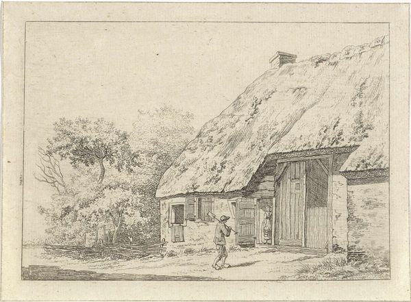 Johannes Tavenraat made this drawing, "Rindern in Kleef," using pen in grey ink. The composition presents a quaint, rural scene dominated by a thatched-roof house. Tavenraat's skillful use of line, combined with subtle shading, captures the rustic texture of the building. The landscape is rendered with loose strokes, evoking a sense of gentle informality. The artist strategically varies the weight of lines, adding depth and enhancing the interplay of light and shadow. Tavenraat's deliberate composition emphasizes the relationship between architecture and nature. The building is not just a structure, but an integrated part of its environment. His work reflects a broader artistic concern with the depiction of rural life and the picturesque qualities of the Dutch landscape. Observe how Tavenraat uses line to define form and create texture. This technique is not just descriptive; it’s an essential part of how the artwork communicates a mood, and a sense of place.