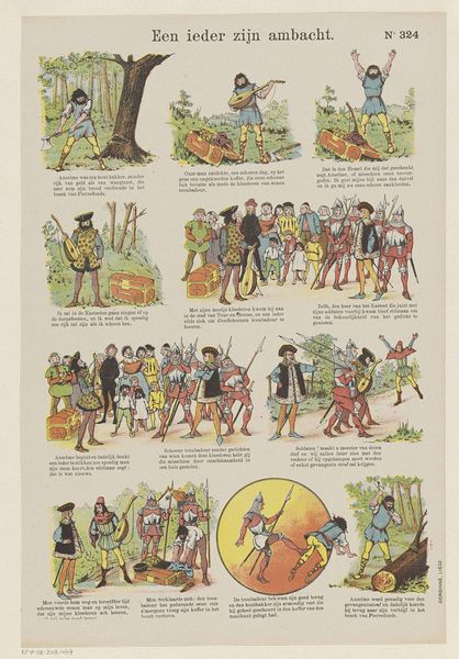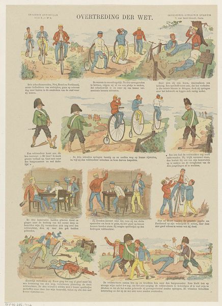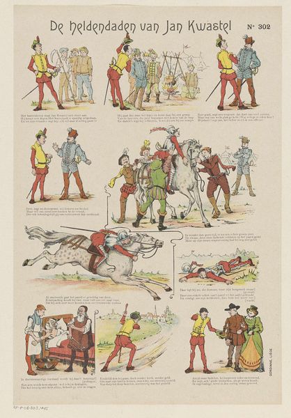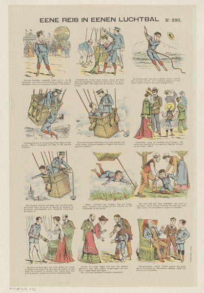 Editor: Here we have "Schijn bedriegt" – a print from between 1894 and 1959 by Gordinne. It has the look of a sort of antique comic strip. What a curious piece! The scenes all appear to depict mischievous happenings and general foolery. What do you make of it? Curator: Oh, what a delightful little pandemonium! For me, this print bubbles with a playful spirit, and yes, something sharper. See how Gordinne embraces the art of sequential storytelling, offering a narrative through twelve separate images, rather like visual verses. Don't you think that each miniature scene contains its own unique flavor? It really invites us to weave our own narratives! Editor: It definitely does. I love how some of the characters appear in multiple panels, implying a continuous story, despite the vignettes. Is there a cultural or historical aspect that maybe I'm missing? Curator: Absolutely! This falls smack-dab into the tradition of satirical prints and comic art of its era, doesn't it? Note how the recurring characters and comedic violence might touch upon popular figures and imperial themes prevalent in its historical period. Do the settings look colonial to you? Editor: Oh, now that you mention it, I do notice some colonial elements represented here. Also the ‘violence’ looks…performative, more funny than scary? Curator: Exactly! And that performative aspect, to me, almost begs to be understood within an understanding of theatrical comedic tropes… and the world Gordinne lived in, of course. In any event, I do love art that gets under my skin! Editor: Definitely food for thought. So the print has several layers – on one hand, humor; and on the other hand, some serious colonial and theatrical references that open up very interesting ways of looking at it. Thank you.