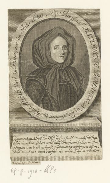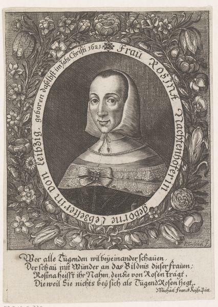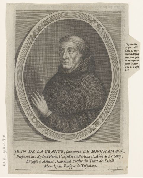 Claude Mellan created this print of Philippe Thibaud using engraving techniques. The composition is structured around a central oval frame, within which Thibaud’s portrait is meticulously rendered. The dominant visual experience comes from the contrast between the detailed lines forming the face and garments, and the smooth, empty space around the figure. Mellan's work reflects an interest in clarity and precision, aiming to capture not just a likeness, but also the essence of the subject. The formal elements—the lines, the texture, and the structured layout—serve to elevate the sitter, presenting him in a way that aligns with the values of his time. The portrait, framed by inscriptions and decorative elements, invites a reading that goes beyond mere representation. The very act of framing, both literally and figuratively, suggests a desire to fix meaning, even as the artwork remains open to ongoing interpretation. The detailed engraving emphasizes the sitter’s features, inviting viewers to consider the relationship between appearance and identity within the cultural context of 17th-century portraiture.