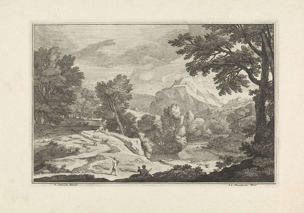 Curator: This etching, "Landscape with a Shepherd and his Flock," by Isaac de Moucheron, likely dates from the late 17th to mid-18th century. It's currently part of the Rijksmuseum's collection. The intricate lines really strike me. Editor: It feels meticulously crafted, almost like a staged tableau vivant. The idyllic shepherd scene contrasts starkly with the imposing rock formation behind them; there's an inherent tension there. I immediately think about representations of labor. Curator: Absolutely. Let’s consider Moucheron's process. The engraving medium, requiring skilled craftsmanship and specific tools, dictates a precise method of production and, ultimately, consumption. Who was purchasing these prints, and why? How were they used? Editor: I’m thinking about the idealization of rural life that this artwork presents, the genre-painting aspect of it. While depicting labor, it certainly romanticizes it, presenting it in a very specific, perhaps even propagandistic, light, far removed from the realities faced by actual shepherds. Who benefits from this type of idealization? Curator: That's a valid point. We must examine the socio-economic context. Etchings like this were often produced for a growing middle class eager to display refined tastes. The consumption of this idyllic scene speaks to a specific cultural aspiration. Editor: Exactly. These idyllic scenes conveniently mask the harsh realities of labor exploitation that enabled the burgeoning middle class lifestyle. It creates a powerful narrative while simultaneously silencing the lived experiences of the working class. The artificial, theatrical elements only reinforces this constructedness. Curator: We also cannot forget that etching, with its reproducibility, allowed for widespread distribution of imagery. Consider the very material: metal plates, acid baths, paper – a complex process of extraction, creation and reproduction. Editor: Right. And the choices Moucheron makes in his technique – the linear, old engraving style– further reinforces an established narrative. The scene feels familiar and comfortable precisely because it echoes existing, dominant ideologies. It doesn't challenge or subvert, but reinforces. Curator: By examining both the technical production and the social implications, we gain a much richer understanding of this piece. It’s not just a pretty landscape; it's a carefully constructed artifact that participated in shaping a specific cultural understanding of labor and leisure. Editor: I agree. This deep dive, intertwining both the material process and the social implications, forces us to actively question the messages this seemingly serene landscape conveys.