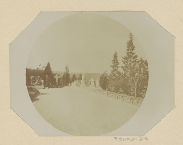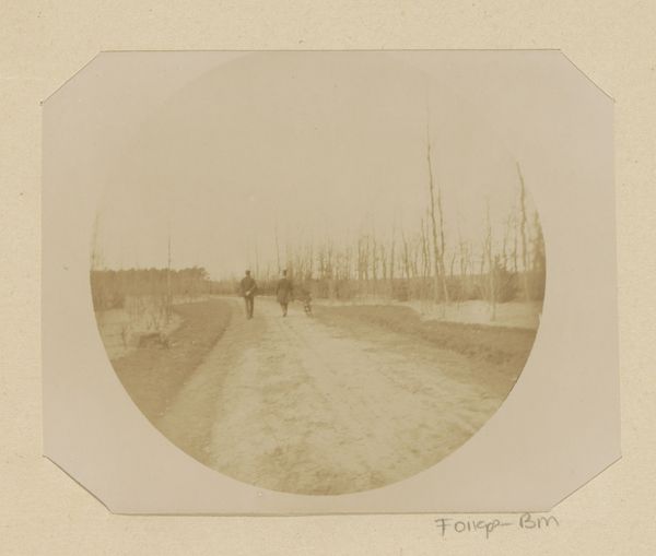 Curator: Here we have Johanna Margaretha Piek's "Gezicht vanuit een geploegde akker nabij Arnhem," a gelatin silver print created sometime between 1889 and 1893. Editor: Immediately, I’m struck by the delicate tonal range, it feels quiet, almost monochromatic. The oval format focuses my gaze. What I perceive is a constructed pictorial space: the dark furrows giving way to what seems to be a structure running through the landscape, bisecting it at nearly the horizontal center line. It feels carefully considered, like a stage set or backdrop, which could well be read as an objective study on the intervention between land and agriculture. Curator: Indeed. The photograph reveals much about the modernization of Dutch agriculture during that period. There's this directness – an almost utilitarian gaze that reveals a particular social interest in landscape at a turning point in the period when ideas around industry, land use, and even social relations, are being intensely questioned, debated, reformed… you have to wonder about her influences from plein-air impressionism as she captured her shots in person, outdoors. Editor: Observe how the placement of the farm building to the left introduces a geometric interplay that feels intentionally structured against the field’s curves. And those furrows—each carefully placed, guiding our eye. It's not merely documentary; it's a composition that subtly elevates the mundane to an almost sublime encounter with the land itself, while holding the entire narrative together. I read that as highly stylized and symbolic in nature. It makes a direct connection with land use and the period's interventionist view of it all, using basic lines, shapes, structures, tonal graduations, textures and balance. Curator: Absolutely. The photographic lens allows Piek to explore the intersection of human activity and the natural world—a testament to the changing cultural perceptions of the rural landscape as the backdrop for the modern experience. Editor: A successful exploration of materiality through a new perspective and methodology of visual composition; it reveals both its formal components and those relevant conceptual, historical layers of analysis, together adding depth and richness for the informed viewer.