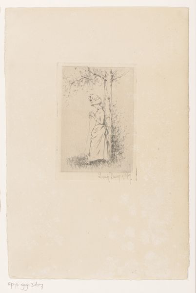 Jean Danguy created this drawing of a half-nude woman seated by the water near a tree using graphite. The composition is structured around a central figure, her form softly rendered against the stark, vertical lines of the tree. This juxtaposition creates an intriguing visual tension, drawing the eye upward. Danguy's use of line and form evokes a sense of classical allegory and symbolist ideals. The delicate rendering of the figure, combined with the detailed attention to the natural setting, creates a layered interplay between the idealized human form and the natural world. The artist seems to challenge fixed meanings by presenting a figure that is both vulnerable and part of a larger, almost primordial scene. Notice how the use of light and shadow directs your gaze to emphasize certain elements, thereby structuring how we perceive the narrative. This interplay suggests that the visual experience is carefully managed, inviting us to question how we engage with both form and representation.