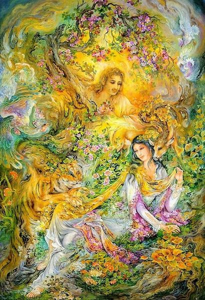 Editor: This painting is an untitled tempera on what I imagine to be a small support, attributed to Mahmoud Farshchian. It has an enchanting quality. There’s a female figure surrounded by mythic beasts and vibrant colours, suggesting a dreamscape. What strikes you most about this piece? Curator: What I find compelling is the artist’s integration of seemingly disparate cultural elements. The style is rooted in Persian miniature painting, yet there's a universality in the imagery that speaks to broader concerns. Look at how the female figure doesn't conform to a Western gaze, her power lies in her connection with nature and myth, resisting a singular narrative. How does that affect your perception? Editor: I see what you mean. She's not an object to be looked at but more like a part of a larger ecosystem within the painting. The figures seem like guardians, a kind of symbolic sisterhood with nature, that steps outside the frame of traditional portraiture. Curator: Exactly! Consider how this artistic choice challenges traditional patriarchal structures within both art history and broader society. Are we seeing here, perhaps, an assertion of feminine power through a connection to ancient myths and the natural world? Do you feel that's supported by its presence as ‘Asian art’? Editor: It certainly shifts the reading. Viewing it within the context of Islamic art adds layers of meaning – perhaps a commentary on spirituality that moves beyond conventional religious interpretation? Curator: Precisely. It reminds us to question dominant narratives and explore intersectional perspectives, particularly when engaging with art from different cultural traditions. Editor: I now recognize how crucial it is to acknowledge and explore the sociopolitical and historical narratives embedded within a painting like this one. Thank you. Curator: And thank you, this has reminded me how fruitful collaborative reading experiences can be.