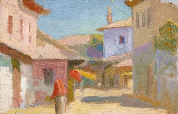 Curator: Here we have Denman Waldo Ross's oil on canvas, "Assouan, Egypt". Editor: The first thing that strikes me is the warmth; it’s like the sun is baked right into the paint. Curator: Notice how Ross uses the architectural structure—the archway, the windows—to frame and organize the bustling scene. Editor: It almost feels like a stage, doesn’t it? With all those figures in the distance. I’m curious about what they are looking at. Curator: The painting's perspective draws your eye toward the light, creating depth and a sense of atmosphere. It’s a careful study in contrasts. Editor: True, but those loose brushstrokes keep it lively. I like that he wasn't afraid to let some areas remain suggestive rather than fully defined. Curator: Indeed. A beautiful exercise in form and color. Editor: A vibrant glimpse of Assouan, frozen in time, yet eternally warm.
