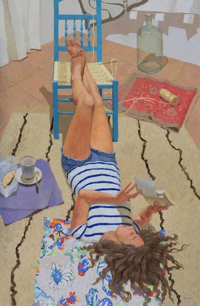 John Michael Carter, born in 1950, created this painting called “Romance” with oil. It depicts a woman reclining, book in hand, surrounded by colourful fabrics. The title itself, ‘Romance’, and the woman's relaxed posture invite us to consider the relationship between art and leisure, particularly within domestic spaces. Looking at the context in which Carter made this painting, we can see how it both reflects and responds to social norms. Made in the contemporary United States, the scene is reminiscent of both academic painting and the bohemian ideals of earlier eras, such as the Pre-Raphaelites in Victorian England. Carter's painting acknowledges the conservative expectations of its time, but also references a counter-culture. This suggests the tensions around gender roles and lifestyle choices that define the social structures of the time. To fully appreciate this work, art historians might explore period fashion, literature, and cultural attitudes towards leisure, offering a more nuanced understanding of its complexities. The meaning of this piece is very much a product of its social and institutional environment.