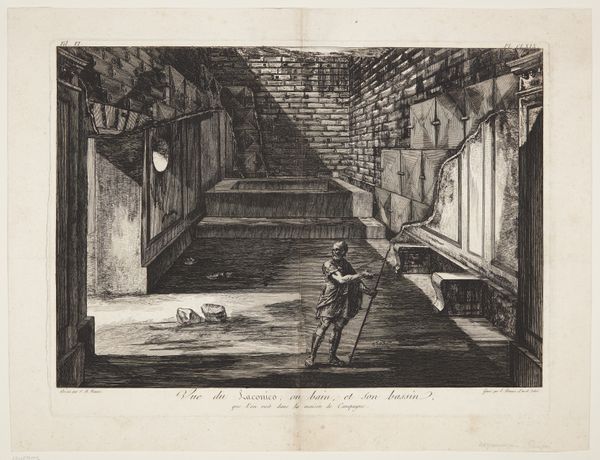 Editor: Here we have Carel Nicolaas Storm van 's-Gravesande’s "Stairway in the Hospital in Kleef," an etching dating from 1851 to 1902, at the Rijksmuseum. I am struck by the way the light and shadow create such a somber mood. What formal elements stand out to you in this print? Curator: Formally, I'm immediately drawn to the artist’s control of line and tone. Notice the deliberate way van 's-Gravesande uses the etching technique to describe the architectural space. The composition hinges on a play of dark versus light. Can you identify any particular strategies? Editor: Well, the light source seems to be coming from somewhere beyond the doorway, highlighting the tiled floor. But what I really see is the contrast created by the person and stairway as focal points. Is that deliberate, or is it my imagination? Curator: The figure, although small, introduces a vertical counterpoint to the receding horizontals of the stairs and tiles, and disrupts the orthogonality we see at first. But look at the top of the stairs -- the "INRI" there echoes on the shadowed figure, with the figure forming a cruciform against the bright doorway. Editor: Oh, I see what you mean! The way the lines converge also seems to create an almost oppressive feeling of confinement. Is that an effect of the vanishing point or the textures created by the printmaking? Curator: It is both. The deliberate exploitation of line to generate specific textures amplifies that sense of compression. He does that really beautifully by leveraging the limitations of etching as his strategy. This reinforces a particular visual effect that contributes to the overall theme, don't you think? Editor: Absolutely. Thinking about the stark contrasts and the composition helps reveal a more meaningful visual commentary. Thank you. Curator: Indeed. It's through understanding these elements that we uncover the complex layers within this seemingly simple artwork.