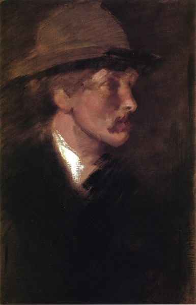 Tom Roberts painted "Eileen," rendering a profile view with oil on canvas. The somber palette is immediately apparent. The dark silhouette of her attire contrasts with the brighter, though still muted, yellows and creams of the background. The composition is carefully structured. Roberts positions Eileen in the left third of the frame, allowing negative space to define her presence. A subtle semiotic interplay of light and shadow shapes her face, drawing attention to her gaze. The hat is a fascinating element, its broad brim and veiled texture creating a sense of mystery. This can be seen as Roberts challenging conventional portraiture. Ultimately, this piece reveals Roberts' interest in formal elements as carriers of meaning. The subdued tones and focused composition function as a form of visual language, inviting us to decipher the emotional and intellectual undercurrents. The painting underscores how form can operate aesthetically and as a discourse.