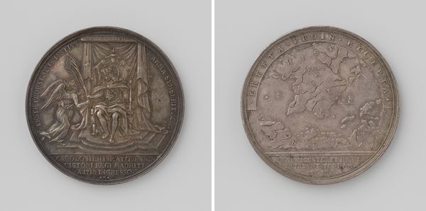 Curator: I see faces in this little landscape, carved in monochrome, peering out from what looks like a silver coin or medallion. It feels archaic and surprisingly intricate for such a small format. Editor: Indeed! This is an engraving by Theunis Kist, made in 1746, commemorating the opening of the West Frisian mint office in Medemblik. What we're looking at is more accurately described as a metal relief print rather than simply an engraving. Curator: Oh, a history lesson in miniature! I am intrigued by the seated woman on the front side, reminiscent of classical depictions of abundance, presiding perhaps over West Friesland itself, holding the coat-of-arms. And a cherub…it all smacks of significant symbolism. Editor: Spot on! The female figure represents the "Virgin" of Medemblik and symbolizes security. You are astute to notice the symbols that underpin the narrative – she embodies prosperity and prudent financial management, while the child with a mallet driving the pile evokes ideas of construction and investment. Curator: That connects wonderfully to the image on the reverse side—the assembly of seated figures gathered around the table. What kind of meeting might they have been having? Editor: Presumably, a meeting of regional West Frisian moneyers and government types to oversee the opening of this very office. Curator: You know, knowing that this scene represents the official opening helps. I kept feeling like something more personal was in progress. A game? A judgment? Editor: A judgement of coin! Maybe the relief can tell us that good coin equals good governance and regional stability. As with any object of cultural significance, the piece invites speculation – perhaps the coin’s owner would have pondered these connections. It presents itself like a memento. Curator: And perhaps a touchstone for conversations like these, bridging eras, no? I wonder who carried it. Editor: Precisely! Its true meaning is perhaps completed by us, still interpreting its symbols centuries on.