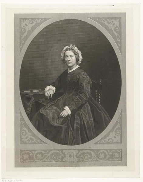 Curator: This is a mezzotint portrait titled "Portret van Charles Erskine," created sometime between 1747 and 1765. It’s currently housed here at the Rijksmuseum and was realized by James McArdell. Editor: There’s an undeniable formality about this composition, almost stiff. The oval frame gives it a compressed, tightly controlled feel. The somber tones do amplify the mood too. Curator: Absolutely. McArdell was a master of the mezzotint technique, known for its rich tonality, as we can see here, from velvety blacks to delicate grays achieved by roughening the plate. The light striking Erskine's face is strategically done to hold the gaze of the viewer. Editor: Considering its creation, what impact might historical events have had on the subject and the reception of this portrait? I mean, how does the sociopolitical context of the 18th century affect our understanding of this image and the identity of Charles Erskine within that era? Curator: Portraits like these served specific social functions. As images intended for wider distribution, they played a crucial role in shaping public perceptions of the sitter, especially in conveying authority, status, and, crucially, the stability of the elite in unstable times. Editor: It is curious that Erskine's adornments are more like afterthoughts, with an artistic quality lacking sharpness of detail or distinct meaning. It seems like a way of softening a sharp, maybe too piercing, rendering. What's your feeling? Curator: Indeed. The face becomes a canvas. It is, in the end, all that matters. Even with its softening and softening effect, the starkness creates visual tension and allows us to focus more on Erskine’s face. The formal design has, in fact, successfully produced an eternal question mark. Editor: A somber, haunting image. Curator: An impressive demonstration of control of medium and presentation.