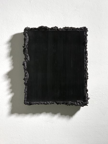 Editor: This intriguing mixed-media piece is an "Untitled" work by Robert Morris, created in 1976. The dark material and folded geometric shapes give it a very austere, almost somber, quality. How do you interpret this work, considering Morris' broader artistic practice? Curator: Morris' work consistently challenges our perception of form and space. Looking at the material—probably felt—and the process of folding, we need to consider how it resists traditional sculptural form. It highlights the labor involved: the cutting, folding, and hanging. This act itself, this manipulation of the felt, is as important as any representational meaning. Editor: So, it’s less about what it represents and more about how it was made and the material itself? Curator: Exactly. Consider also that Morris emerged from a minimalist context that was incredibly rigorous, formal and often relied on industrial means. His turn toward felt, and seemingly haphazard arrangements, brings in an element of the body, and implicitly the labor that makes art happen. Editor: I see, it brings attention to the hand of the artist, or craftsperson, almost. It also raises questions about industrial versus handmade. How does this fit within the broader art world in the 1970s? Curator: The 1970s witnessed a growing interest in process-based art, performance, and questioning established art hierarchies. Works like this offered a critique of mass production, challenging the clean lines of manufactured objects. It brings our attention back to how things are made and consumed, prompting us to rethink our relationship with materiality. Editor: I hadn't thought about the element of consumption before. It is fascinating how simply changing the material changes the message. Thanks for sharing your perspective! Curator: Of course! Analyzing the material and means of production allows us a far deeper understanding of the work’s cultural and societal significance.