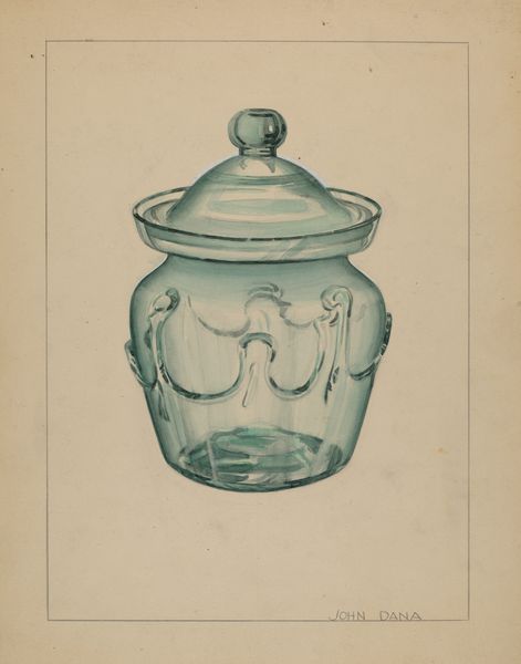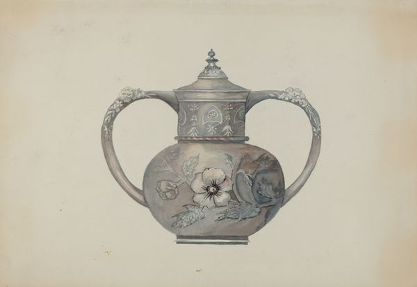 Editor: Here we have Beulah Bradleigh's "Pewter Spoon Holder," created around 1937 using watercolor and colored pencil on paper. There’s something delicate yet restrained about the palette. How do you interpret this work? Curator: I see this work as part of a broader investigation into domestic spaces and the role of women within them during the interwar period. Bradleigh’s detailed rendering elevates an everyday object, prompting us to consider the labor and artistry often overlooked in functional items. What might the choice of pewter, and the act of depicting a spoon holder, signify about societal expectations around domesticity and gender roles at that time? Editor: That's fascinating. I hadn't considered it beyond its aesthetic value. The flowers also add another layer. Are they purely decorative, or do they carry a symbolic weight? Curator: The floral motifs likely reference popular decorative styles, but we can also explore their symbolic associations. Flowers, historically, have been tied to femininity and nature. How do these associations play into the overall narrative of domesticity Bradleigh presents? And what does it mean to use fine art techniques to portray such an ordinary object, usually deemed 'craft'? Editor: So, it's challenging the hierarchy between art and craft and maybe making a comment on women's work being undervalued? Curator: Precisely. This piece encourages us to deconstruct traditional art historical frameworks. What happens when we bring feminist theory into the viewing of this work? We might ask, how does Bradleigh negotiate the space between artistic expression and societal expectations? Editor: That's a perspective I hadn't even considered. It gives a totally new lens for appreciating even what seems like a simple drawing. Curator: Exactly! Thinking about this artwork has pushed me to consider how the ordinary can carry potent social commentary. Editor: Me too, I am going to research art as social commentary! Thank you.
