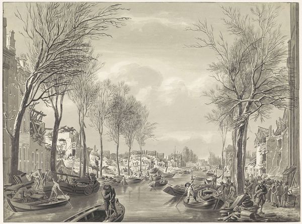 Curator: Here we have Ludwig Gottlieb Portman's 1807 print, "Het Rapenburg te Leiden na de ramp," now held in the Rijksmuseum's collection. The scene is rendered with both etching and engraving. Editor: What a bleak image! The monochromatic palette amplifies the sense of devastation, focusing our eyes on the jagged lines of broken structures and denuded trees. Curator: Portman meticulously details the aftermath of an explosion that decimated the Rapenburg canal district in Leiden. What interests me most is the tension he crafts between observable disaster and communal response. Look how the social fabric starts to be repaired already. Editor: Absolutely. This print functions as both historical record and social commentary. Notice the figures scattered throughout—some clearing debris, others simply observing. The visual emphasis here captures not only destruction, but also a society grappling with it. It really underscores human resilience, I think. Curator: It's a carefully constructed cityscape—ruins are offset by the stoicism of the surviving architecture. Even the seemingly random placement of figures becomes integral to the narrative. One begins to understand this wasn’t created for its pure aesthetic, but as commentary during this historical time. Editor: Considering the style, the landscape elements feel imbued with a distinctly Romantic sensibility – there is nature as both victim and witness to this trauma. And that subtle etching conveys more mood than any vibrant hue could. Curator: Indeed, beyond its representational accuracy, Portman also constructs an emotional space for viewers to contemplate disaster and community. Editor: A somber reminder, powerfully rendered. Curator: Agreed. This print prompts reflection on both past trauma and our capacity to recover from it.