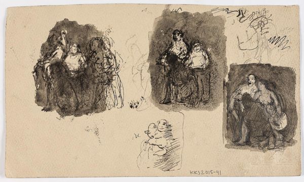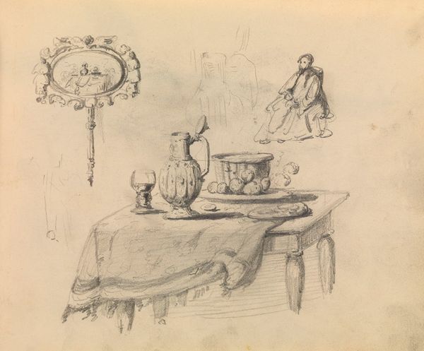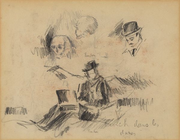 Editor: This is James Ensor's "Kop, schoteltje en figuren," created sometime between 1880 and 1885, a pencil drawing. It's quite a busy composition! So many figures, a cup, all sketched with evident speed. What strikes you about it? Curator: I'm drawn to the immediate nature of the medium. Pencil allows for rapid notation, a direct translation of thought onto paper. Notice the variations in pressure and the visible marks of the artist's hand; it exposes the labour and choices behind representation. Are we seeing studies, quick impressions before a more 'finished' work, or something intended as complete in itself? Editor: That's interesting, the idea of sketches versus a finished piece. So you see value in the process itself? Curator: Absolutely. The accessibility of the materials - paper, pencil - removes a layer of preciousness we often associate with 'high art'. Ensor is playing with the concept of value itself: What makes art 'valuable', the end product or the labor, the concept, the materials involved? How would these studies influence Ensor's known work? Editor: So, by examining the material reality - the simple pencil on paper - we can question these hierarchical distinctions? The idea of labor is a thread that might lead us to connect this to broader economic questions in 1880s Europe, perhaps? Curator: Precisely. It reminds us that art-making is a form of work, embedded within social and economic contexts. Consumption of cheap readily available materials. Ensor seems to implicate artistic practices with all the rest, drawing them into question, a question of value and materials. Editor: I never thought about art-making as embedded in such material concerns, this is incredibly enlightening! Curator: Indeed. Considering art through the lens of its production can radically alter our understanding and appreciation.
