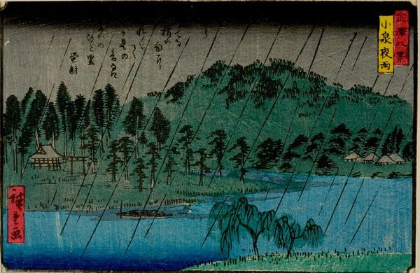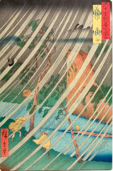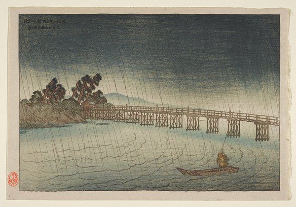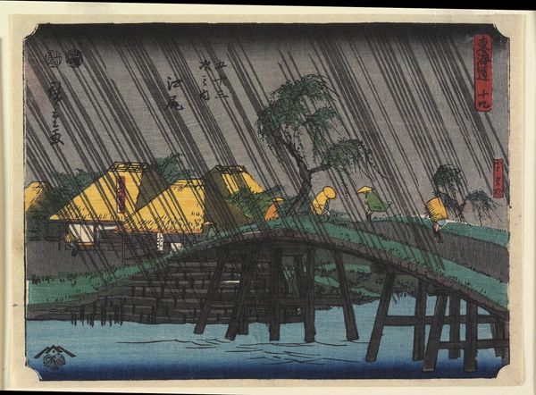 Curator: Ah, Utagawa Hiroshige's "No. 19, Ejiri: Koyoshida Bridge," part of his "Fifty-three Stations of the Tōkaidō Road" series. Look at that driving rain! Editor: Yes, it’s utterly melancholic, isn't it? It's as if the artist bottled a memory of a fleeting shower and released it for us to experience. Curator: Consider the woodblock printing process. The labor involved in carving those lines, transferring the image... it speaks to the intense effort behind mass-produced imagery. Editor: I feel a kinship with those figures trudging across the bridge. Each step echoes in the relentless rhythm of the rain, each drop a tiny reflection of their journey. Curator: It’s fascinating how Hiroshige uses the landscape to explore themes of travel, commerce, and the natural world. Editor: Absolutely, and the water seems to whisper tales of journeys, both weathered and beautiful. Curator: Seeing it this way gives new depth to the piece. Editor: Indeed, a moment of reflection amidst the storm.