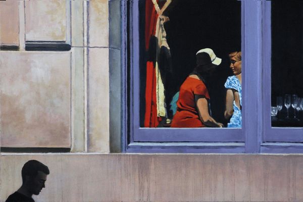 Curator: This oil painting is entitled "First Floor" by Nigel Van Wieck. There's something intriguing about its realism combined with what seems to be an expressionist touch. What are your first thoughts on this work? Editor: It feels incredibly voyeuristic. The darkness of the surrounding space focuses all attention on this lone figure in the elevator, bathed in a kind of artificial, almost stage-like light. There's a cinematic quality to it that's compelling but also unsettling. Curator: I agree. The composition reinforces this sense. The architectural elements framing the woman create a proscenium effect, highlighting the performance of daily life within urban environments. Van Wieck often deals with these liminal spaces. Elevators, hallways... places of transition and brief encounters. Editor: Precisely, and the woman in the red dress immediately pulls at established cultural threads. Red is a charged color. In Western art, it symbolizes love, passion, anger, and warning. Is she the archetypal femme fatale, momentarily trapped? Is it a modern reimagining of waiting as an allegorical symbol? It seems like a meditation on contemporary womanhood, vulnerability and projection. Curator: Absolutely. The urban setting adds to that feeling of tension. If we think about the history of women in art, so often seen within domestic interiors, this changes the historical social dynamics. Editor: And consider that elevators themselves are relatively new. In effect they're closed, private boxes thrust into public view. Are we considering here the idea of vertical urban social stratification, where social anxieties are subtly raised, literally with every floor? It lends an unexpectedly tense reading of an everyday modern scenario. Curator: That's a very insightful take. By depicting this isolated figure within this confined space, Van Wieck prompts us to reflect on issues of privacy, exposure, and even class within contemporary urban life. Editor: Yes, it makes you ponder on all kinds of personal stories or experiences. All those shared, awkward silences! Curator: A mundane everyday scenario transformed into an emotionally charged vignette. Food for thought. Editor: Definitely! Makes you look differently at every elevator from now on.