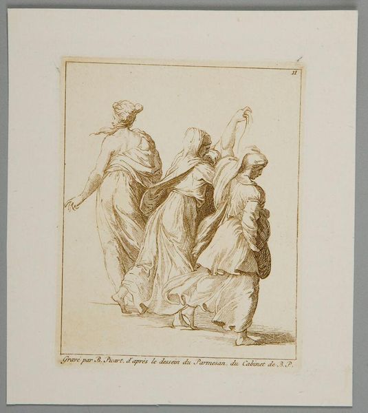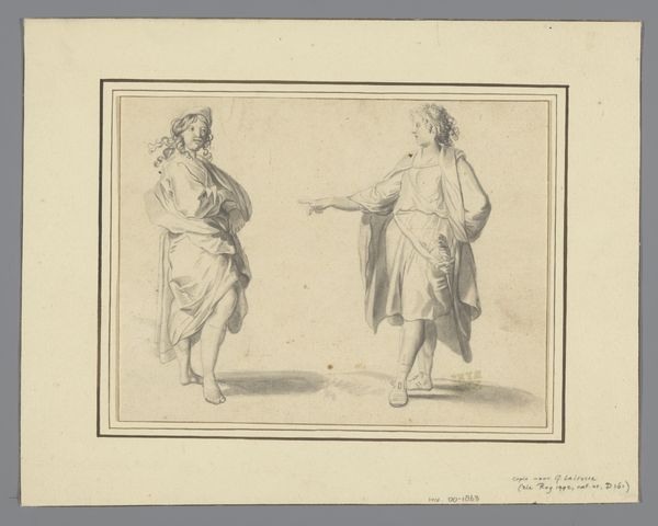 Editor: This pen drawing, "Drie Vrouwen," or "Three Women," by Frederick Bloemaert, dates from around 1650 to 1700 and is currently held at the Rijksmuseum. There is something captivating about its simplicity, almost like a classical frieze. How do you interpret this work? Curator: Looking at this piece, I'm struck by its presentation of idealized femininity filtered through a very specific societal lens. The women are rendered in a classical style, referencing ancient sculpture. Consider the time in which it was produced. What role would idealized images of women play in society then? Editor: To set standards of beauty, maybe? Reinforcing gender roles, like silent muses, not active participants in public life? Curator: Precisely! Bloemaert worked during the Baroque period. Images like these often circulated amongst a specific elite, reinforcing ideas about decorum and social order. Note how they're presented – unclothed or barely draped, evoking both virtue and vulnerability, which could function as warnings or idealizations, depending on the viewer and context. What do you think this suggests? Editor: So, these women aren’t just aesthetic objects; they’re embedded in a network of power, shaping and being shaped by societal expectations? Curator: Exactly. And consider the role of the Rijksmuseum itself. How does the institutional framing of this work affect its meaning today? Is it still a lesson in beauty, or has its presence here granted it the role of a historical document that we interpret, even challenge? Editor: That’s fascinating. I hadn’t considered the museum as a key part of how we "read" it. I initially saw a graceful study, but now I see how profoundly the drawing speaks to its socio-political world. Curator: Indeed, analyzing art through this lens helps us understand how these images once functioned and their resonance in our contemporary world.
