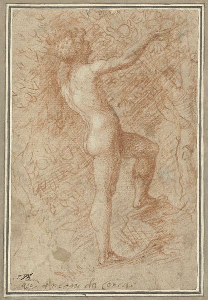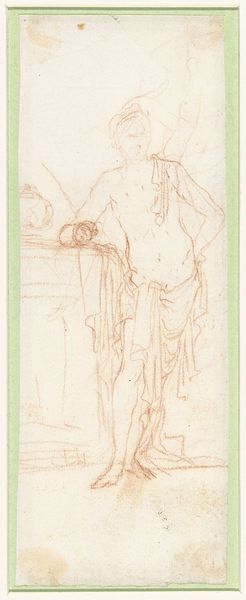 Curator: Up next is "Youth with a Mantle Standing in a Niche," a work dating sometime between 1527 and 1585 attributed to Luca Cambiaso. It's currently held here at the SMK, drawn using ink. Editor: Immediately, what strikes me is its vulnerability. There’s something incredibly raw and immediate about the line work that brings this figure to life with almost brutal honesty. Curator: Absolutely, and that honesty might be precisely what Cambiaso was after. It is important to understand that drawings like this weren't necessarily seen as standalone works but were critical components of artistic training, explorations of form and, specifically here, an emphasis on classical models. The ink wash helps emphasize the form in the absence of color. Editor: And those classical models were deeply connected to power structures, wouldn't you agree? Showing the body, celebrating idealized male forms… it was about conveying ideals about beauty, strength, and status. Curator: Exactly. Think about how art academies codified drawing practices. Those institutional methods perpetuated a specific hierarchy, pushing this type of classically informed art above other kinds of material practices or vernacular forms. What seems to be only a simple nude drawing represents, actually, very codified techniques. Editor: I can see how someone deeply immersed in the traditions of craftsmanship and drawing like Cambiaso must have negotiated with all those codes in producing the figure. One wonders how much individual innovation he actually put into creating art within those well-established frameworks. Curator: He’s also clearly grappling with the visual language of Mannerism – there’s that elegance and deliberate artificiality in the pose, in how the drapery hangs, it all feels staged and curated. It reminds us that everything is carefully constructed. Editor: The niche itself seems less a structural element and more of an attempt to frame the figure, giving it that staged presence you pointed out. So much of this art plays with creating that relationship with the viewer, creating that illusion, through what are effectively just practiced strokes. Curator: It does offer much more when we start considering it in relation to artistic practice. So let’s move on to our next item in this collection. Editor: Yes, fascinating how process and historical forces become embedded within the materials. Thanks for unraveling that, it does cast a new light on it for me.
