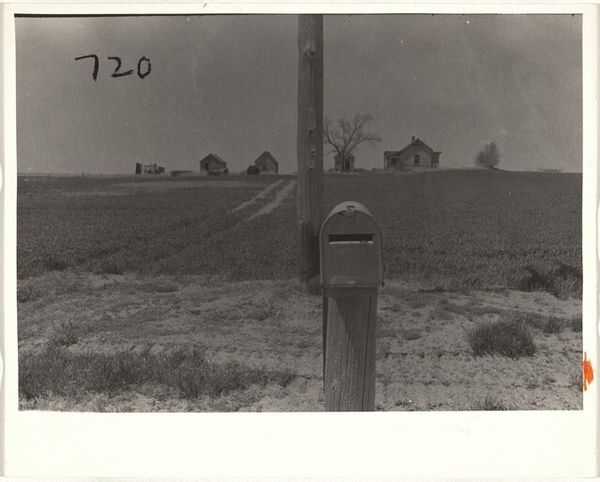 Editor: So, this is Dorothea Lange's "Power farming displaces tenants from the land in the western dry cotton area, Childress County, Texas," taken in 1938. It’s a gelatin silver print. I am struck by the emptiness of the scene; the desolate, curved rows of farmland leading up to that lonely, weathered house. It feels hauntingly silent. What story do you see in this photograph? Curator: I see a powerful visual commentary on the social and economic shifts occurring during the Great Depression. Lange, through the Farm Security Administration, documented the plight of displaced farmers. This image isn't just a landscape; it’s a staged political arena. Note how the curves almost push us *away* from the house; it seems unattainable. How do you think the title informs your reading of the work? Editor: It makes it very clear that this displacement is directly linked to technological advancements. Power farming – mechanized agriculture – replaced human labor, and the tenants were forced off their land. Curator: Exactly. The FSA aimed to raise awareness, implicitly advocating for governmental intervention. Consider the museum itself, exhibiting this photograph. What role do museums play in shaping how we understand the politics of images? Editor: It’s interesting – by exhibiting it, the museum is continuing to amplify Lange’s message, but perhaps also framing it within a specific historical narrative that the institution curates. There's a shift from a raw, urgent cry to something memorialized, something "art." Curator: Precisely. The photograph gains artistic value but also becomes subject to institutional interpretation, shaping public memory of the event. And the act of preservation itself... Whose stories get preserved, and who decides? Editor: This has definitely opened my eyes to thinking about photography and museums through a much more critical lens. It's more than just a picture; it's a document with agency and its meaning changes over time. Curator: And understanding those changing meanings, those forces *acting* upon a seemingly still image, is where true appreciation begins.